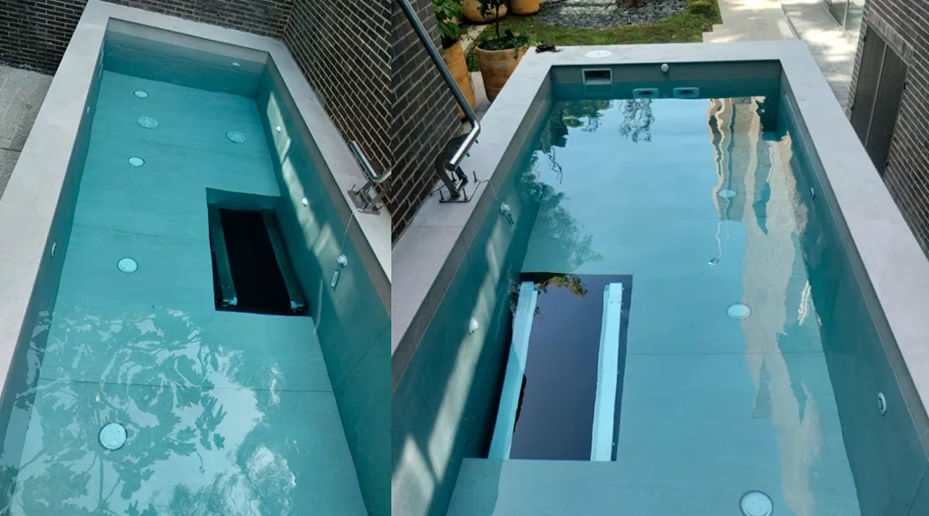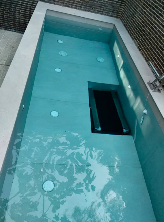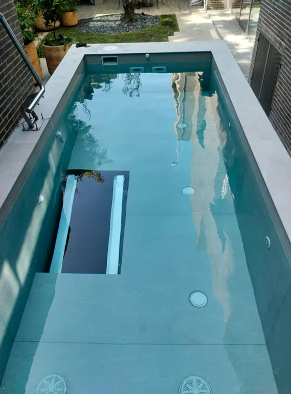 Este proyecto fue desarrollado en un entorno urbano exclusivo en Bogotá, integrando una solución de entrenamiento de alto nivel en un espacio compacto y funcional. Se trata de una piscina climatizada a 31 °C, pensada para sesiones de ejercicio físico, rehabilitación o uso recreativo durante todo el año.